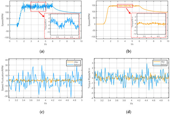 The simulation results. (a) The speed curve and load torque waveform of the loading motor before the application of this method. (b) The speed curve and load torque waveform of the loading motor after the application of this method. (c) The speed fluctuation of the loading motor at a steady state from t = 3 s to t = 5 s, before and after the application of this method. (d) The torque ripple of the loading motor at a steady state from t = 3 s to t = 5 s, before and after the application of this method.