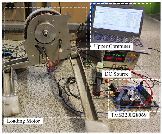 To verify the described method, a comparative experiment was performed on a self-developed experimental platform. TMS320F28069, a DSP of Texas Instruments, was used as the controller. A PMSM equipped with an independent speed regulation system was used as the bearing system. The bearing motor outputs periodic driving torque to drive the loading motor. The torque transfer can occur between the bearing motor and loading motor only through mechanical connection. The parameters of the loading motor are the same as in Table 1. The simulated load inertia is 5.06 kg·m2. The experimental platform is displayed in Figure 8.