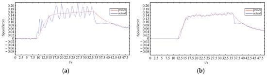 Figure 9a,b display the preset speed of the bearing motor and the actual speed of the loading motor before and after the application of this method, respectively. The aforementioned speed curves detail the degree of ‘synchronous motion’ between the loading motor and the bearing motor when simulating the load inertia.