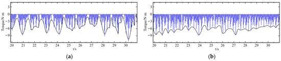 Combined with the analysis in Figure 9a and Figure 10a, the strong-coupling torque disturbance that is introduced by the loading motor responds to the periodic driving torque, which renders the ‘synchronous motion’ of the loading motor with the bearing system difficult, resulting in the fluctuation of the load torque output. Therefore, the smooth load torque cannot be output.