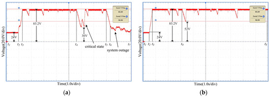 Figure 11a,b display the bus voltage of the system before and after this method is applied. Combining Equation (15) with the previous analysis revealed that because of the effect of the load inertia value, when iq < −ωψf/R, Pin > 0, which indicates that the loading motor operates in the state of energy consumption braking and requires additional positive input power. When the motor operates in the state of energy consumption braking, an additional input power results in a decrease in the bus voltage, which affects EDLSS stability. In this experiment, when the bus voltage decreases to less than 36 V, the EDLSS is in a critical state and cannot maintain the normal operating voltage of the processor and the peripheral circuit.