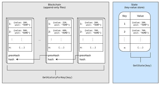 After executing a smart contract, the resulting write set is changing the state. If the write set is empty, the transaction can be considered useless, since it did not change the outside world. Currently, Fabric supports two KVSs, LevelDB (default) and CouchDB. Access to the current state is possible via GetState(key), and access to transactions which modified the state is possible via GetHistoryForKey(key). Figure 1 presents the relationship between these components.