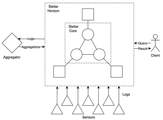 On the other hand, we have decentralized solutions [,] based on popular blockchain networks. Those systems usually struggle with low efficiency or do not have native mechanisms that separate information about the source from reading metric values. By default, the architecture offers full transparency of the transactions performed.