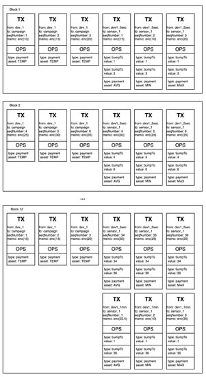 The paper is constructed as follows. Section 2 contains a discussion regarding the usage of the blockchain to monitor IoT devices. Next, Section 3 contains a problem statement in the context of the usage of blockchain technology in industrial IoT devices (IIoT), especially while we require access to historical data or better performance of systems using blockchain. To achieve the outlined goals, we propose a method of keeping track of logs produced by IoT devices in the blockchain. Section 4 describes the proposed optimizations that allow us to retrieve data from the blockchain in near real-time. The proposed method is generic enough to apply to different types of blockchain, including those that do not support smart contracts. To demonstrate the effectiveness and universality of the proposed mechanism, two prototypes are created for the Stellar network [] and Hyperledger Fabric []. In Section 5, we present the conducted experiments and achieved results. As an example, we prepare and execute a set of queries and their optimized counterparts. Finally, in this section, we discuss issues related to privacy and efficiency when monitoring IoT infrastructure using the blockchain. In Section 6, we present conclusions and potential improvements. We conclude with open issues discussion and future works. As a result of this article, we propose a fully decentralized, privacy-preserving and efficient platform for aggregating and analyzing data using the blockchain network.
