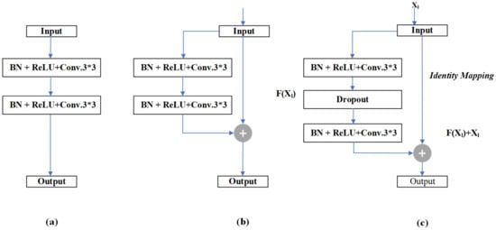 where and are the input and output of the residual unit respectively, is the residual function, and are parameters of the block. is the activation function. Figure 2a presents the plain and residual unit. As shown in Figure 2b, the residual unit contains two combinations of batch normalization (BN), ReLU, and convolutional layer. Although the residual unit improves the gradient propagation, it also increases the network parameters, which can easily lead to overfitting. For this, we introduced another module called dropout [28] in the residual unit. Dropout is a regularization technique, which drops a unit (along with connections) at training phase with a certain probability p (a common value is p = 0.5). It was mostly applied on top layers that had a large number of parameters to prevent feature coadaptation and overfitting [29]. As shown in Figure 2c, the dropout layer was added behind the first convolution layer in the residual unit.