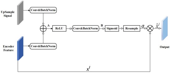 Attention mechanism is a core technology that has been widely used in natural language processing (NLP), statistical learning, image detection, speech recognition, and other fields. It was the proposal of Non-local [30] that applied the attention mechanism to computer vision for the first time. In order to focus on the target organs related to the segmentation task, we refer to the method proposed by Attention U-Net, which adds an Attention Gate to the network architecture. The structure of Attention Gate is shown in Figure 3, with the upsampling features from the expansion path and the corresponding features of the encoder as its inputs. The former is used as a gating signal to enhance the learning of target regions relevant to the segmentation task and to suppress task-irrelevant regions [31]. Firstly, both the inputs are passed through the operation of Convolution and BatchNorm and added to obtain A. A is obtained through the first activation function ReLU and Convolution and BatchNorm operation to obtain B. Next, B passes through the second activation function Sigmoid and Resample to obtain the attention coefficient α, and finally, the encoder feature is multiplied pixel-by-pixel by the coefficient α to obtain the output.