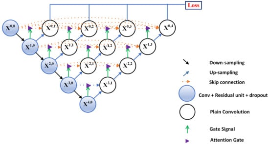 where represents a convolution operation followed by an ReLU activation, and are used for attention gate and upsampling operations respectively, and [] denotes the concatenation layer. Figure 5 further explains the first skip pathway in Residual-Attention UNet++.