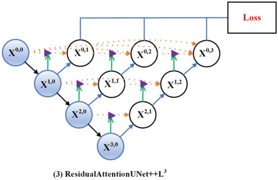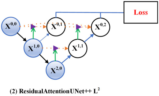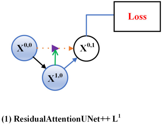 Figure 6, Figure 7, Figure 8 and Figure 9 show how the choice of segmentation branch results in architectures of varying complexity [33]. We used Residual-Attention UNet++ to denote Residual-Attention UNet++ pruned at level . For example, Residual-Attention UNet++ means the prediction result is from node , which is a maximally pruned model. Moreover, Residual-Attention UNet++ , which is not pruned, indicates that the prediction result comes from node .