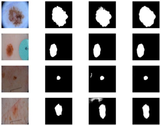 Qualitative assessment of UNet++ and Residual-Attention UNet++ performance on skin cancer. First column: original image, second column: ground truth, third column: UNet++’s output, last column: Residual-Attention UNet++’s output.