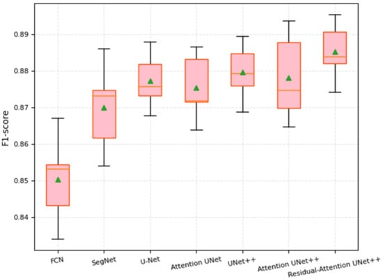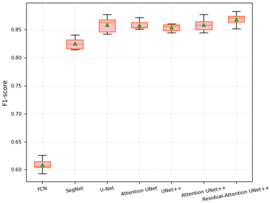Figure 11 shows some of the example outputs from the testing phase. As observed in Figure 11, the target lesions were segmented accurately with almost the same shape of ground truth in most cases. In addition, it can be clearly seen that the input image in the second row contains two spots; the Residual-Attention UNet++ still segmented the desired target accurately. Moreover, if we examine the third and fourth rows in Figure 11, the UNet++ and Residual-Attention UNet++ predicted two lesions and one lesion respectively, while ground truth only had one, which shows the robustness of the proposed model. In addition, Figure 12 shows the comparison between Residual-Attention UNet++ and other methods on F1-score after multiple experiments, which further illustrates the robustness of the proposed model.