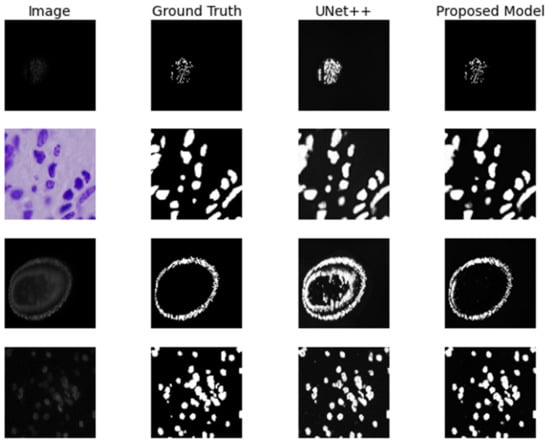 Table 3 shows the summary of how well the proposed model performed against UNet++ and other existing method. As observed, Residual-Attention UNet++ improved some metrics that are critical for the semantic segmentation task, including IoU and DC, by 3.9% and 16.87% compared with the UNet++, respectively.