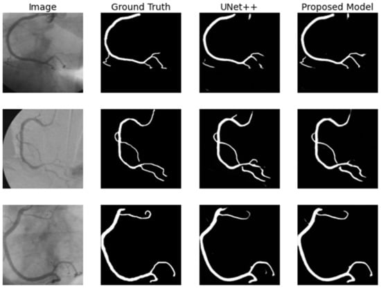 Figure 15 shows the qualitative results for the UNet++ and Residual-Attention UNet++ models, respectively. As observed, compared with UNet++, the definition of the coronary artery edge in the proposed model was closer to the ground truth.