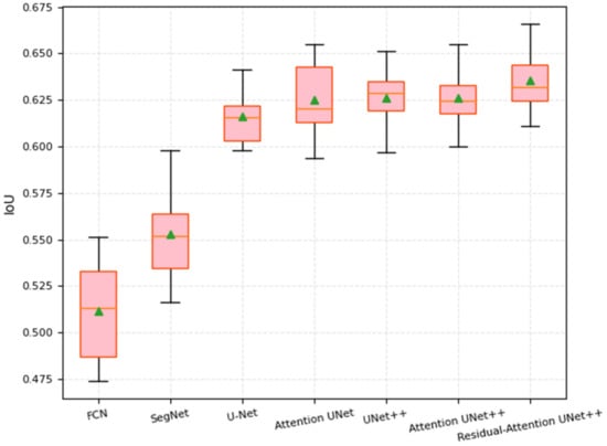 Figure 16 shows the comparison between Residual-Attention UNet++ and other methods on IoU after multiple experiments, which further illustrates the excellent performance and robustness of the proposed model.