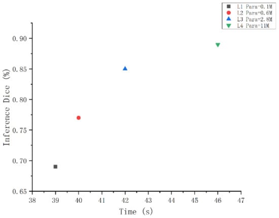 Figure 17 shows the Inference time, dice coefficient, and parameters of Residual-Attention UNet++ under different pruning degrees. As seen, Residual-Attention UNet++ L3 achieved, on average, 8.696% reduction in inference time and 75.635% reduction in parameters while degrading dice coefficient by only 3.167%. As for the Residual-Attention UNet++ L1, it achieved, on average, 15.217% reduction in inference time and 98.915% reduction in parameters while degrading the dice coefficient by 21.834%. It can be seen that pruning can not only reduce the model parameters and inference time, but also affect the segmentation performance. Therefore, it is quite crucial to choose a reasonable pruning strategy according to the actual scenario. Furthermore, considering that most deep CNN segmentation models have long inference times and require large computational resources, it makes sense to apply the pruned models to small computers and mobile devices for CAD.