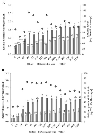 The reducing power of beverages was mainly affected by the presence of the AGF (Figure 1A). The highest reducing power was determined for the P15F (105 TE mg/100 mL—a 2.7- and a 2.1-fold increase compared to the C and P0). It was also observed that the addition of FSG positively affected the reducing properties of the raw beverages. This tendency was not noted after digestion, where the values of reducing power seemed to be tailored by both FSG and lyophilized vegetables/fruit. What is important, the replacement of sprouted lentil flour with AGF allowed for increasing the activity of the potentially bioaccessible fraction. The release of peptides from legume flour during digestion in vitro was reported previously [49]. Generally, the compounds exhibiting reducing properties were bioaccessible: the REF values ranged from 1.1 (CV) to 2.6 (P0); however, a negative effect of FSG was visible.