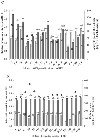 Reducing properties of the powdered beverages. (A)—Reducing power; (B)—Ability to quench ABTS radicals; (C)—Ability to quench OH-radicals; (D)—Chelating power. C—beverages based on lentil sprouts; P—beverages based on lentil proteins; V—lyophilized parsley and broccoli sprouts; F—lyophilized strawberry and raspberry; 0–15—amounts of flaxseeds gum (%). REF—the relative bioaccessibility factor; TE—Trolox equivalents. Means (±SD) followed by different letters are significantly different (n = 9; p ≤ 0.05).