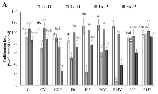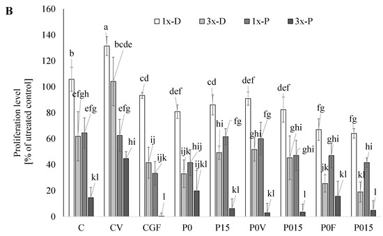 Anticancer properties of the beverages. (A) AGS (Human Caucasian gastric adenocarcinoma); (B) HT 29 (Human Caucasian colon adenocarcinoma). 1x-D, 3x-D (lyophilized digests applied at concentrations being the equivalents of 0.7% and 2.1% beverage, respectively); 1x-P, 3x-P (potentially bioaccessible phenolics applied at concertation being the equivalents of 0.7% and 2.1% beverage, respectively). C—beverages based on lentil sprouts; P—beverages based on lentil proteins; V—lyophilized parsley and broccoli sprouts; F—lyophilized strawberry and raspberry; 0–15—amounts of flaxseeds gum (%). Means (±SD) followed by different letters are significantly different (n = 9; p ≤ 0.05).
