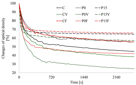 The beverages were hydrated according to the procedure described in Section 2.3 and dissolved (1:4) with distilled water. Then, they were placed in a quartz cuvette and absorbance of 660 nm was recorded for 2 h. (30 s intervals). Finally, the curves describing the stability of the beverage were drawn and used to estimate some parameters characterizing the stability of the beverage. They included: (1) initial absorbance at 660 nm, (2) change of absorbance in time (Δ660), and (3) time required for reducing 20% of initial absorbance (T0.8).