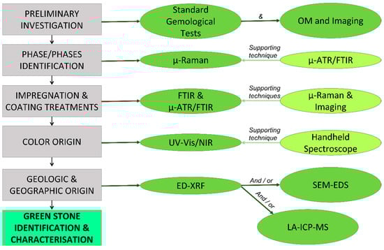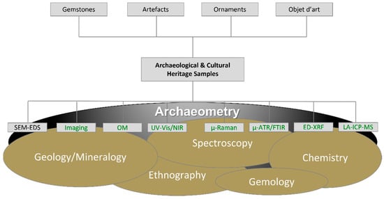 Archaeometry requires a multidisciplinary approach to characterize archaeological and cultural heritage samples. Gemstones, artefacts, ornaments, and objets d’art, with several exceptions, belong to archaeological and cultural heritage samples. To identify and characterize these type of samples, in an archaeometric context, the contributions of different expertise are required, including geologists, mineralogists, etc. Moreover, many analytical techniques are necessary. The acronyms correspond to: SEM-EDS: Scanning Electron Microscopy with Energy Dispersive Spectroscopy; OM: Optical Microscopy; UV-Vis/NIR: Ultraviolet-Visible/Near-InfraRed spectroscopy; µ-Raman: micro-Raman Spectroscopy; µ-ATR/FTIR: micro-Attenuated Total Reflection/Fourier Transform InfraRed Spectroscopy; ED-XRF: Energy Dispersive X-ray Fluorescence; LA-ICP-MS: Laser Ablation Inductively Coupled Plasma Mass Spectrometry. Imaging techniques: the term “imaging” is commonly used for diagnostics-per-image systems, which typically include multispectral observation (i.e., imaging by fluorescence reaction, Wood lamp, etc.). It is interesting to note that all techniques reported by the green color in the gray boxes are typically applied in scientific gemology.