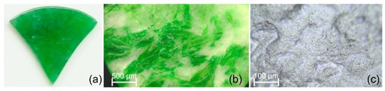 Jade aspect and texture details: (a) jadeite-jade, imperial green, Photo: M. Musa—Gemological Education and Certification Institute (GECI) reference stone collection: (b) jadeite-pumpellyite association (green veins) in albite white matrix (OM Image, 5× magnification, darkfield light), Photo: M. Musa—GECI reference stone collection; (c) nephrite-jade-polished cabochon surface, detail of its characteristic texture, where no iso-oriented acicular/columnar crystals are evident, but the grains are associated to elongated crystals, oriented in different directions (OM Image, 20× magnification, reflected light), Photo: M. Musa—Gulf Institute of Gemology (GIG).