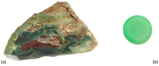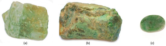 Finally, the chalcedony; the green variety can be mainly distinguished between chromium-chalcedony and chrysoprase (Figure 4). As per the variety name, in the first case, the origin of the green color is correlated with chromium naturally present as a trace; on the other hand, the chrysoprase characteristic “apple green” color is due to a nickel-rich mineral associated with chalcedony, typically belonging to the garnierite mineral group [106]. The processes producing chalcedony are still under discussion; typically, quartz-rich fluid precipitation is hypothesized as a mandatory condition [117], whether the process is hydrothermal with crystallization in geodes or metamorphic.