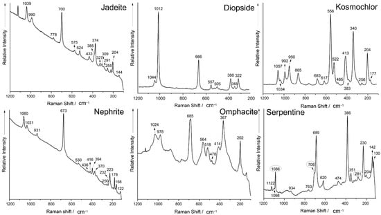Similar to Table 4, the same can be observed by the reference spectra reported in Figure 5, where all six spectra reported show relatively strong, sharp, and well-defined bands, as a consequence of the high crystallinity of the materials analyzed. Only the omphacite phase shows Raman bands with characteristic Full Width at Half Maximum (FWHM) of the band amplitude higher than other phases (Figure 5), as diopside or jadeite. Generally speaking, by Raman spectroscopy, the higher the crystalline grade of the sample, the sharper are the scattered bands [65,119]. Nevertheless, to obtain reliable Raman spectra on Green Stones, the analyst has to pay particular attention to the choice of laser source. While for inosilicates, and silicates generally, a visible red source (i.e., 632.8 nm) could be one of the best selections, due to the high affinity of the wavelength with the silicon tetrahedra vibration [120], when the phase is Cr-rich, a strong fluorescence issue can be generated. On the basis of this consideration, the availability of a second source, for example, a visible green (514.5/532 nm) or NIR (785 nm) laser, could be a good option to solve the issue and complete the characterization. The fluorescence issue is one of the main limits of the technique [65]. This problem might be solved changing the source but multi-laser systems are not always available. Finally, surface sample treatments (i.e., waxing, varnishing, etc.) can generate Raman fluorescences.