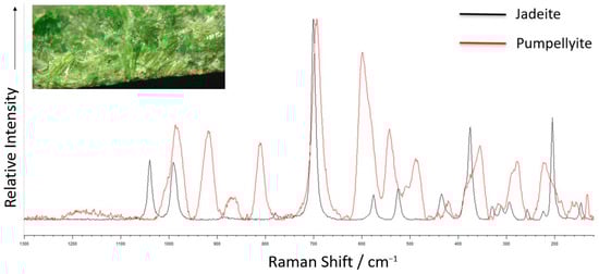 Moreover, as previously mentioned, a potential difficulty could emerge in jadeite-pumpellyite identification, considering prudential tolerance of about 2 cm−1 Raman shift for the spectrum interpretation, correlated with possible substitutions and/or crystal lattice defects, which are very common in natural phases [90]. In fact, these two phases diverge for only a 3 cm−1 Raman shift on the main vibrational bands. In Figure 6, the reference Raman spectra of the two phases are reported. Despite the Raman shifts of the main vibrational bands being extremely close (700 vs. 697 cm−1, see also Table 4), many differences can be highlighted by observing the trends of the entire spectra. The pumpellyite phase shows not only a spectrum richer in band numbers, but many of those bands are broader with respect to the jadeite ones, suggesting the presence of convoluted components [138].