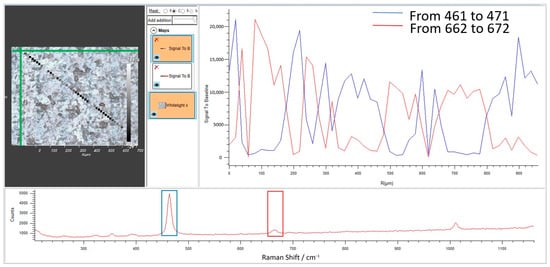 The “Raman” effect was discovered in 1928 by Indian physicist Sir. C. V. Raman, who observed a faint wavelength shift between a light source (monochromatic) and light returned after the interaction with a sample. In a typical Raman experiment, monochromatic radiation (the laser source) is used to excite the sample. The available laser sources belong to UV, visible, and Near-InfraRed (NIR) spectral regions. Thus, the Raman scattered light will also be in the visible region if visible excitation is used. No energy is lost for the elastically scattered Rayleigh light, while the Raman scattered photons lose some energy corresponding to the specific vibrational modes of the sample [65]. Among the many advantages of this technique, the main ones are: it is a non-destructive technique and does not require any sample preparation; the spectrum is characteristic for every mineral phase, similar to a “fingerprint” [66]; the technique proves to be very suitable for material identification, by the comparison with reference spectra [67]; and, finally, the spectroscopes can be coupled with an optical microscope, in order to perform the analysis in a confocal way [68,69].