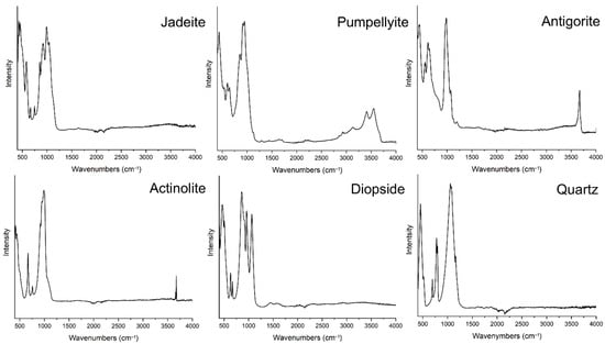 - Shurvella, H.F.; Rintoul, L.; Fredericks, P.M. Infrared and Raman spectra of jade and jade minerals. Int. J. Veh. Saf. 2001, 5. Available online: http://www.irdg.org/the-infrared-and-raman-discussion-group/ijvs/ijvs-volume-5-edition-5/infrared-and-raman-spectra-of-jade-and-jade-minerals/ (accessed on 13 July 2022).