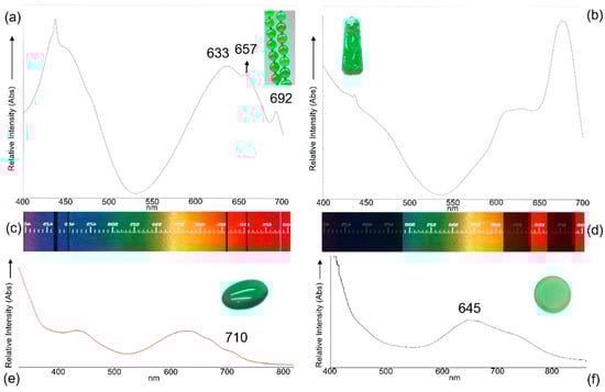 Generally, the gemological handheld spectroscope can provide crucial information to help detect a treatment or identify a synthetic. Indeed, this useful portable small instrument can show the absorption in the visible light spectrum (400–700 nm), correlated with the colors’ causes [60]. In addition, it does not require a polished surface, so it can be applied on rough or mounted gem material and also loose gems.