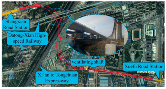 This paper is based on the tunnel section between Shangxian Road Station and Xuefu Road Station of Xi’an Metro Line 14 (hereinafter referred to as the “Shang-Xue section”), which runs under a special bridge section of the Datong–Xi’an High-speed Railway over the Xi’an–Tongchuan Highway. The bridge is a typical 32 m simply supported box girder, in which the plane size of the bearing platform of the high-speed railway bridge is 6.8 m × 12.2 m, and the height is 2.5 m. Eight bored piles are installed under each bearing platform, and the diameter of the pile foundation is 1.25 m. The outer diameter of the shield tunnel tube is 6.0 m, the thickness is 0.3 m, and the ring width is 1.5 m. The minimum distance of the tunnel from the pile foundation is 3.78 m. Figure 1 shows the relationship between the location of the subway interval tunnel and the HSR bridge.