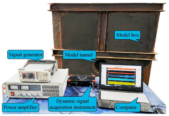 In order to carry out relevant research, a dedicated single-point train vibration load model test system was developed, which mainly consists of three parts: a model test box, a loading system, and a dynamic response test system. The model box size is: length × width × height = 1.5 m × 1.5 m × 1.6 m. The box is mainly made of thick 5 mm steel plate and 10-gauge channel steel, welded and processed. The loading and dynamic response test system is mainly composed of a signal generator, a power amplifier, a small exciter, acceleration sensors, and a dynamic signal collector, as shown in Figure 2.