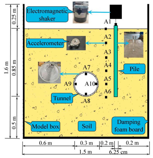 A total of 10 miniature piezoelectric accelerometers were used to measure the response of the segmental lining and soil, where the monitoring points in the soil between the pile and tunnel were arranged from top to bottom as A1~A6, and the monitoring points inside the tunnel were arranged as A7~A10, as shown in Figure 3. Acceleration monitoring data were converted to actual data according to similar ratios to facilitate comparison and analysis.