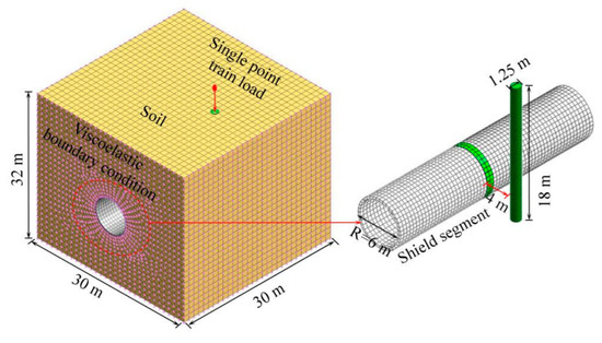 In China, the country’s transportation infrastructure facilities are increasingly improved. In 2021, the total operating mileage of China’s railways exceeded 150,000 km and the operating mileage of China’s high-speed railways exceeded 40,000 km. More than 4000 km of railways have been added, including 2150 km of high-speed railways [1,2]. More and more high-speed trains are running on high-speed railways between cities. As a typical vibration load, the vibration load of high-speed trains induces the dynamic response of the pile-soil foundation and nearby structures [3,4,5,6]. Under a long-term vibration load, nearby structures may have problems such as cracking and concrete block spalling, and the original damage and destruction have a more adverse impact on the structure [7,8]. Therefore, it is of great significance to study the characteristics and propagation law of the dynamic response of a pile-soil foundation with an adjacent tunnel under vibration train load and to provide a theoretical basis for the safety evaluation of the adjacent tunnel of similar projects under train load.