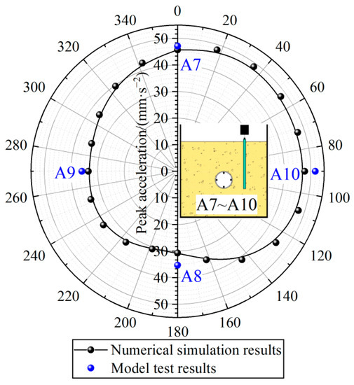 It can be seen from Figure 6 that the numerical calculation results and the model test results are close and the peak accelerations at the ground surface are all maximum values, all of which exceed 225 mm·s−2. With the increase in the distance from the ground surface, the peak acceleration of the foundation under vibration load decreases continuously, especially at the buried depth of the tunnel. Figure 7 suggests that the peak accelerations of the tunnel lining are less than 50 mm·s−2, and the peak acceleration of the tunnel lining near the load point (upper side and right side) is significantly greater than that far from the load point (lower side and left side). It is mainly because the hollow tunnel structure can be approximated as a particular “vibration isolation trench” which hinders the vibration propagation in the stratum.