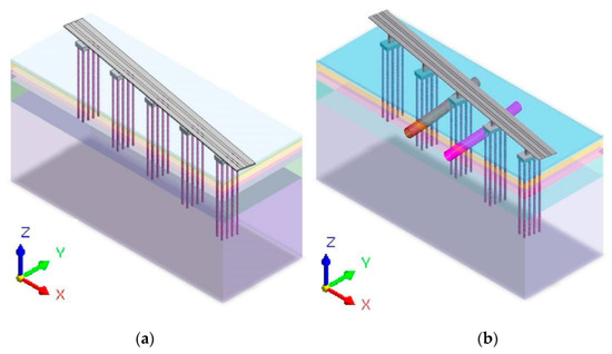 In order to further study the effect of the adjacent tunnel on the dynamic response of pile-soil composite foundations under moving train loads, two numerical models of an ordinary pile-soil composite foundation and a pile-soil composite foundation with a proximity tunnel are established according to the project case, as shown in Figure 8. The size of the two numerical calculation models is the same, with a length, width, and height of 160, 60, and 80 m, respectively. The mechanical parameters of the soil and structure are given in Table 2, respectively. The concrete structures mainly considered in the numerical simulation include shield segments, piles, and the piers and caps of the bridge, of which the outer diameter and the thickness of shield segments are 6.0 m and 0.3 m, respectively. The diameter and the length of the pile are 1.25 m and 46 m, respectively. The size of the cushion cap is 12.2 m × 6.8 m and the width of bridge is 12.2 m. The distance between two cushion caps is 32 m. The same as for the numerical simulation in Section 2.5, the elastic constitutive model is adopted in the numerical calculation model and the viscous boundary conditions are used to restore the infinite state of the real foundation.