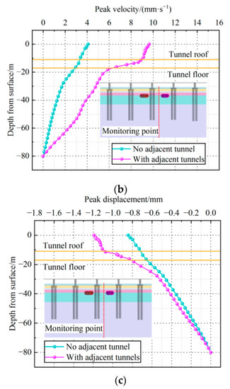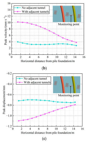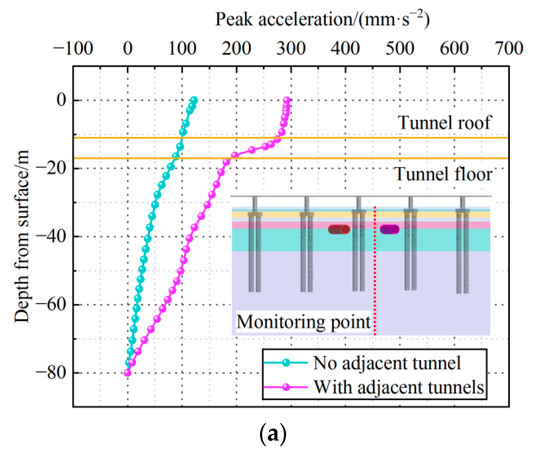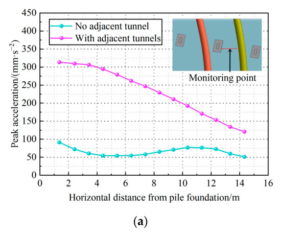 For the numerical calculation, a train speed of 350 km/h is taken. Referring to the results of Chen et al. [26] and Zhang et al. [28], the peak vibration acceleration, peak vibration velocity, and peak vibration displacement were used as the indexes to evaluate the dynamic response. The results of the vertical monitoring points between the pile foundation and the tunnel and the horizontal monitoring points at the burial depth of the tunnel axis were extracted to analyze the dynamic response of the foundation. The dynamic response indexes of the monitoring points for the two numerical models are shown in Figure 9 and Figure 10.