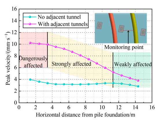Figure 11 indicates that, when the pile-soil foundation has an adjacent tunnel under moving train loads, the foundation between the pile and tunnel is affected by the moving train loads and the ratio of dangerously affected zone: strongly affected zone: weakly affected zone is about 1:2:1. The peak vibration velocity of the foundation at the burial depth of the tunnel within 3.6 m from the pile (red zone) exceeds 10 mm·s−1. The foundations in this zone account for approximately 24.8% of the foundations between the piles and the tunnel. The underground structure within this zone of high-speed train operation has a large safety risk, which must be paid attention to, and corresponding damping measures must be adopted. The foundation in the range of 3.6~11.4 m near the pile (yellow zone) is the strongly affected zone, and it represents approximately 53.8% of the foundation between the piles and the tunnel. Although the vibration will not cause serious damage to the underground structure within this zone, it is still recommended to use the corresponding vibration damping measures. The foundation outside 11.4 m from the pile to the tunnel (green zone) are in the weakly affected zone, and the impact of the moving train loads on the underground structure in this area is low. This part of the foundation accounts for approximately 21.4% of the foundations between the piles and the tunnel. The importance and deterioration of the underground structure are taken into account to determine whether damping measures need to be taken. Taking this project as a case, the tunnel structure of the underpass section is in the weakly affected zone. If the tunnel is used with low requirements, such as ordinary hydraulic tunnels, the impact of moving train loads can be ignored. If the tunnel is used with high requirements, such as traffic tunnels, especially those with rails, then partial vibration damping measures can be considered. Moreover, if the adjacent tunnel has been in service, this needs to be considered in combination with the service time of the tunnel. Other, similar projects can use this treatment to evaluate the impact of moving train loads.