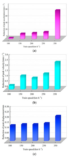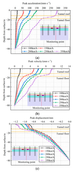 When the train speed is 100 km/h, the peak vibration acceleration, peak vibration velocity, and peak vibration displacement inside the foundation from the roof to the floor of the tunnel are reduced by 3.3 mm·s−2, 0.4 mm·s−1 and 0.15 mm, with a reduction of 28%, 26%, and 19%, respectively. When the train speed increased to 350 km/h, each dynamic response index was reduced by 86 mm·s−2, 2.6 mm·s−1, and 0.24 mm, respectively, with a reduction of 31%, 29%, and 23%. In order to show this change feature more intuitively, the reduction of the dynamic response indexes from the tunnel roof to the tunnel floor under different train speeds are shown in Figure 14. With the increase in train speed, each dynamic response index decreases with the increase in distance from the ground surface and pile, and the proportion and amplitude of the decrease all increase. The reduction of the peak vibration acceleration increases most significantly, from 3.3 mm·s−2 to 86 mm·s−2, an increase of 26 times. The impact of the tunnel structure on the attenuation of the dynamic response induced by moving train loads within the pile-soil foundation becomes more evident with the increase in train speed.