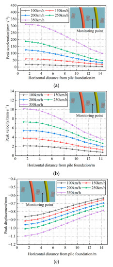 Horizontal dynamic response characteristics of the foundation for different train speeds. (a) Peak vibration acceleration. (b) Peak vibration velocity. (c) Peak vibration displacement.