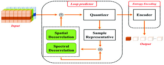 In this work, a loop predictor is used for near-accurate prediction of target pixels by removing the correlation of hyperspectral images. The input image data is passed through the loop predictor point by point. The differences between the predicted and original values are quantized. Subsequently, the entropy encoder encodes the quantized residual image and outputs the compressed codestream. The same algorithm with the same parameters must be used at the decoding stage during the reconstruction process after inverse entropy coding. Figure 1 presents a pictorial representation of the compression scheme, which explains the essential steps. The five significant steps of the proposed scheme, including spatial predictor, spectral predictor, controlled quantization, sample representative, and entropy coding, are discussed in the following subsections.