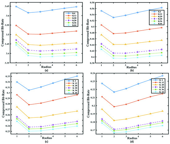 The accuracy of the RLS predictor has a strong correlation with the prediction length k of the input vector . Additionally, to preserve the causality of the pixels in the context window, the local mean predictor is used to estimate . Therefore, the radius r of the context window is another important parameter that directly affects the compression results. In order to evaluate the effects of the k and r parameters on near-lossless compression performances, average bit rates of the proposed scheme at different peak absolute errors are shared in Figure 3 for the AC datasets.