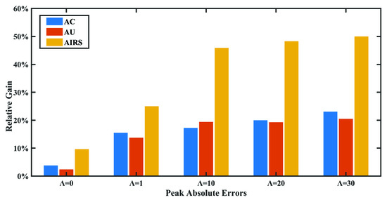 Graphically, the relative gain of our scheme over CCSDS-123-AC is represented in Figure 4 for different datasets. Each color represents the comparison results using different datasets, and each cluster indicates a different peak absolute error. Therefore, the higher percentage means that our scheme is superior. The results indicate that the proposed scheme provides an average optimization from 5.29% to 31.19% in bit-per-pixel change for different peak absolute errors. The AIRS images, especially, outperform by almost with .