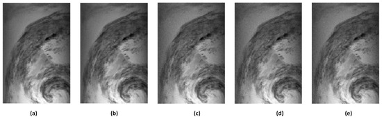 Visual comparison for the “AIRS Grand16 1256th band” image: (a) original, (b–e) reconstructed image at , respectively.