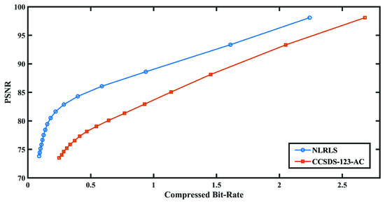 It can be seen that the compression bit rate of each technique decreases rapidly as a function of . The reported results indicate that our scheme outperforms the other known schemes for all sensors. For lossless coding (), our scheme beats the other schemes by a slight margin. For near-lossless encoding (), our scheme provides outstanding compression results; i.e., it clearly yields the lowest ratio of all the compared methods. Compared to CCSDS-123-AC, which has the best-known compression results, on average, the proposal provides benefits ranging from 0.11 to 0.6 bpp, depending on the allowed absolute error of the peak.