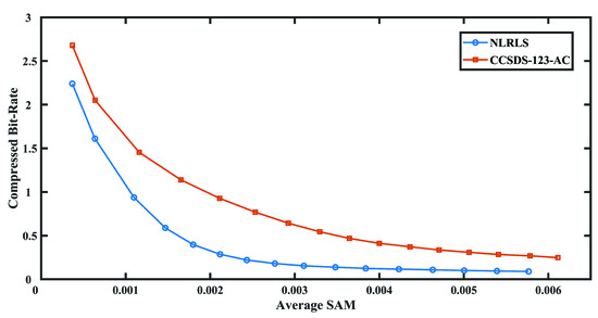The experimentally obtained data points have been highlighted by marked dots, and linear interpolation is used between the markers. It can be seen that under the same compressed bit rate, the proposed scheme has a higher peak signal-to-noise ratio and a smaller average spectral angle. Further, for image quality, as measured by the PSNR and SAM, our approach is competitive compared to the best-known CCSDS-123-AC scheme.
