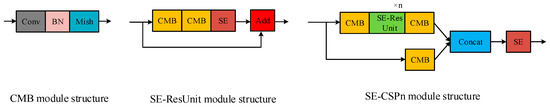 The SE attention mechanism module [20], which screens out the attention for channels by learning the correlation among channels, can be easily embedded into the network model and only adds a small amount of model overhead and complexity. In the bauxite detection task, with the deepening of the training network, the bauxite characteristics gradually weaken, which can easily cause missed detection. However, embedding the SE attention module in the YOLOv4 network can enhance the learning ability of the network, automatically learn the importance of different channel characteristics, and improve the accuracy of bauxite sorting. As shown in Figure 2, the SE module is embedded in the Inception module to form a new SE–Inception module. In this study, the SE attention module is embedded into the Resunit module to form a new SE–Resunit module, and the SE module is embedded behind the CSPn module to form a new SE–CSPn module. The specific structure is shown in Figure 3.