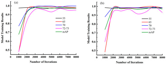 Abscissa represents the number of model iterations; ordinate represents the model training results, and different colors represent different types of bauxite. The left figure (a) represents the training results of the unbalanced datasets, and the right figure (b) represents the training results of the balanced datasets.