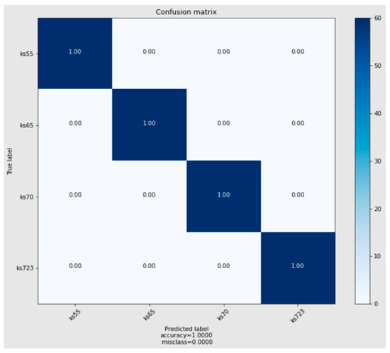 Confusion matrices obtained under the optimal model for the test sets of four ores. It can be seen from the figure that the detection sensitivity of the four types of ores is very high; the detection accuracy is almost 100%, and there is no misjudgment.
