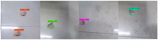After the above analysis, we obtained a bauxite sorting model based on the improved YOLOv4 network. In order to verify whether the model is reliable and whether the unknown pictures can accurately locate the bauxite and correctly identify it, we took some bauxite pictures for verification, and the results are shown in Figure 8. From left to right are the corresponding test results of No. 55, No. 65, No. 70, and Nos. 72–73, which can correctly identify the type of bauxite and correctly locate it. Through this test result, it is verified that the model of bauxite balanced datasets trained 7000 times under the improved YOLOv4 network has good bauxite sorting ability and can realize the real-time detection and classification of bauxite.
